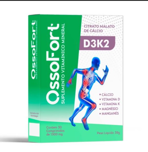 Ossofort é um suplemento vitamínico e mineral, desenvolvido para ajuda na atuação da manutenção da saúde. Formulado com cálcio, vitamina D, K, magnésio e manganês, o composto ajuda na função óssea.
